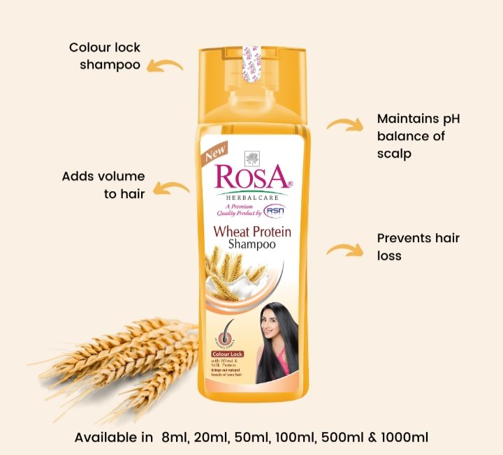 Get voluminous hair with Rosa Wheat Protein Shampoo. Enriched with Wheat & Milk Protein. It is a combination of moisture-balancing and film-forming properties that work synergistically to give hair better body control, as well as help the structure of the color.